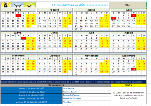 Nota: Los días 24 y 31 de diciembre el mercado bursátil sólo funcionará hasta las 14 horas) En la siguiente imagen podemos ver el calendario bursátil para el año 2026. Los días considerados festivos (relleno de color rojo y fondo de color blanco), los sábados y domingos (relleno de color amarillo y fondo de color rojo.